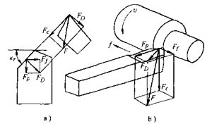 (1) 切削力的產(chǎn)生與切削力的分解 切削加工時(shí),在刀具的作用下,被切削層金屬、切屑和工件已加工表面金屬都要產(chǎn)生彈性變形和塑性變形,這些變形所產(chǎn)生的抗力分別作用在前刀面和后刀面上:同時(shí),由于切屑沿前刀面流出,刀具與工件之間有相對運(yùn)動(dòng),所以還有摩擦力作用在刀面和后刀面上。這些作用在刀具上的合力就是總切削力F,簡稱切削力。
