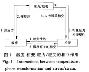 鋼在淬火過程中存在極為復(fù)雜的溫度、相變、應(yīng)力/應(yīng)變相互作用,在此方面已有許多報道[1]。如圖1所示,在淬火過程中,溫度造成熱應(yīng)力并影響材料的力學(xué)參數(shù)(彈性模量、泊松比、屈服強度和應(yīng)變硬化率等),從而影響材料的力學(xué)行為。應(yīng)力/應(yīng)變則以變形熱的形式反過來影響溫度的變化。隨著溫度的降低,在達到相變條件后將發(fā)生相變。溫度是決定相變的因素之一,但其本身又受著相變潛熱的影響。內(nèi)應(yīng)力的存在,可通過一種通常稱為應(yīng)力誘導(dǎo)相變的機制而影響相變的進程。在相變過程中,各組成相的比容差異將造成相變應(yīng)力,同時由于材料的絕大多數(shù)參數(shù)除了依賴于溫度實際上也依賴于相態(tài),因此,相變也會對材料的力學(xué)行為產(chǎn)生影響。此外,在有內(nèi)應(yīng)力存在時相變過程中還會伴隨一種“反常”的塑性行為,即材料在應(yīng)力低于屈服強度的情況下就可以發(fā)生不可逆變形的現(xiàn)象,稱為相變塑性。