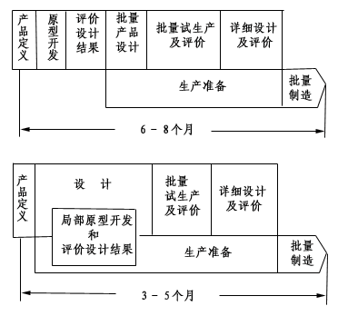 產品開發(fā)是一個從市場獲得需求信息,據(jù)此構思產品開發(fā)方案,最終形成產品投放市場的過程。雖然在產品開發(fā)過程中并非所有步驟都可以平行進行,但根據(jù)對產品開發(fā)過程的信息流分析,可以通過一些工作步聚的平行交叉,大大縮短產品開發(fā)時間。例如:日本NEC公司將某種產品原本歷時6--8個月的開發(fā)過程,通過并行重組縮短為3個半月,如圖1。