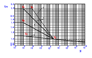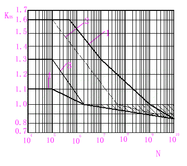 圖1 彎曲疲勞壽命系數(shù)KFN(當N>Nc時,可根據(jù)經(jīng)驗在網(wǎng)紋區(qū)內(nèi)取KFN值)