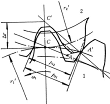 a、齒輪制造及裝配的誤差,輪齒受載后產(chǎn)生的彈性形,將使嚙合輪齒的法向齒距Pb1與Pb2不相等(見左圖),因而輪齒就不能正確嚙合傳動,齒輪傳動瞬時傳動比就不是定值,就會產(chǎn)生角加速度,于是引起動載荷或沖擊。 |