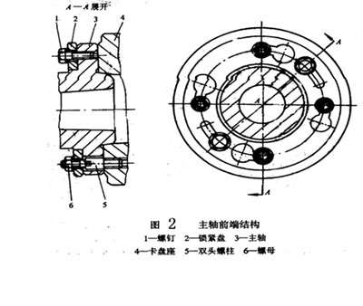 主軸前端采用短錐式結(jié)構(gòu)。安裝時(shí),使事先裝在撥盤或卡盤座4上的四個(gè)雙頭螺母通過(guò)主軸肩及鎖緊盤2的圓柱孔,然后將鎖緊盤2轉(zhuǎn)過(guò)一個(gè)角度,雙并沒(méi)有螺柱5外于鎖緊盤的溝槽內(nèi),并擰緊螺釘1和螺母6,就可以使卡盤或撥盤可靠地安裝在主軸的前端。這種結(jié)構(gòu)裝卸方便,夾緊可靠,定心精度高;不高前端懸伸長(zhǎng)度較短,有利于提高主軸組件的剛度,所以得到廣泛的應(yīng)用。主軸軸肩右端面上的圓形撥塊用于傳遞轉(zhuǎn)矩。主軸尾端的圓柱面是安裝各種輔具的安裝基面。