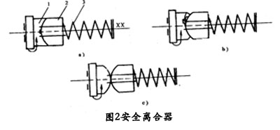 機(jī)床過載時(shí),蝸桿ⅩⅩ上的阻力矩加大,安全離合器傳遞的轉(zhuǎn)矩也加大,因而作用在螺旋形端面齒上的軸向力也加大,當(dāng)軸向力超過規(guī)定值時(shí),軸向力將超過彈簧3的彈性力,彈簧不再保持離合器左、右兩半相嚙合,于是軸向力便將離合右半部推開。見圖2b,這時(shí)離合器左半間1繼續(xù)旋轉(zhuǎn),而離合器右間部卻不能被帶動(dòng),所以在兩者之間產(chǎn)生打滑現(xiàn)象,見圖2c,使傳動(dòng)鏈斷開,于是保護(hù)了傳動(dòng)機(jī)構(gòu),使它們不致因過載而損壞。當(dāng)過載現(xiàn)象排除后由于彈簧3的彈力 ,安全離合器恢復(fù)嚙合,重新正常工作。