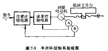 3)半閉環(huán)控制數(shù)控機(jī)床,這種控制方式對(duì)工作臺(tái)的實(shí)際位置不進(jìn)行檢查測(cè)量,而是通過(guò)與伺服電動(dòng)機(jī)有聯(lián)系的測(cè)量元件,如測(cè)速發(fā)電機(jī)A和光電編碼盤B(或旋轉(zhuǎn)變壓器)等間接檢測(cè)出伺服電動(dòng)機(jī)的轉(zhuǎn)角,推算出工作臺(tái)的實(shí)際位移梁,并與指令值進(jìn)行比較,用差值來(lái)實(shí)現(xiàn)控制(圖7-5)。這種控制方式工作臺(tái)沒(méi)有完全包括在控制回路內(nèi),精度沒(méi)有閉環(huán)高,調(diào)試卻比閉環(huán)方便。