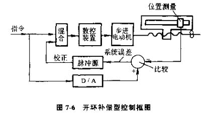 4)開換補(bǔ)償型數(shù)控機(jī)床,將上述三種控制方式的特點(diǎn)有選擇地集中起來(lái),可以組成混合控制的方案。大型數(shù)控機(jī)床,需要高得多的進(jìn)給速度和返回速度,又需要相當(dāng)高的精度。如果只采用全封閉的控制,機(jī)床傳動(dòng)鏈和工作臺(tái)全部置于控制環(huán)節(jié)中,安裝調(diào)試十分復(fù)雜,為了避免這些矛盾,可以采用混合控制方式。圖7-6為開環(huán)補(bǔ)償方式的組成框圖。它的特點(diǎn)是:基本控制選用步進(jìn)電動(dòng)機(jī)的開環(huán)控制伺服機(jī)構(gòu),附加一個(gè)校正伺服電路。通過(guò)裝在工作臺(tái)上的直線位移測(cè)量元件的反饋信號(hào)來(lái)校正機(jī)械系統(tǒng)的誤差