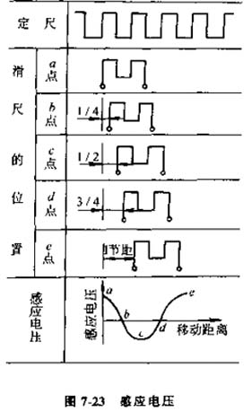 圖7-23所示為滑尺在不同位置時定尺上的感應(yīng)電壓,當(dāng)定尺與滑尺繞組重合時,如圖中a點(diǎn),這時感應(yīng)電壓最大。當(dāng)滑尺相對于定尺平行移動后,感應(yīng)電壓便逐漸減小,在錯開1/4節(jié)距的b點(diǎn)時感應(yīng)電壓為零。再繼續(xù)移動到1/2節(jié)距的c點(diǎn)時,得到的電壓值與a點(diǎn)位置相同,但極性相反,隨后感應(yīng)電壓在3/4節(jié)距位置d點(diǎn)時又變?yōu)榱,在移動一個節(jié)距到e點(diǎn)時,電壓幅值與a點(diǎn)位置相同。這樣滑尺在移動一個節(jié)距的過程中,感應(yīng)電壓變化了一個余弦波形。由此可見,在激磁繞組中加上一定的交變激磁電壓,感應(yīng)繞組中就產(chǎn)生相同頻率的感應(yīng)電壓,其幅值大小隨著滑尺移動作余弦規(guī)律變化。滑尺移動一個節(jié)距,感應(yīng)電壓變化一個周期,感應(yīng)同步器就是利用這個個感應(yīng)電壓的變化來進(jìn)行位置檢測的