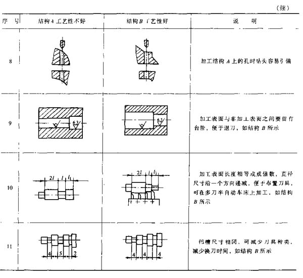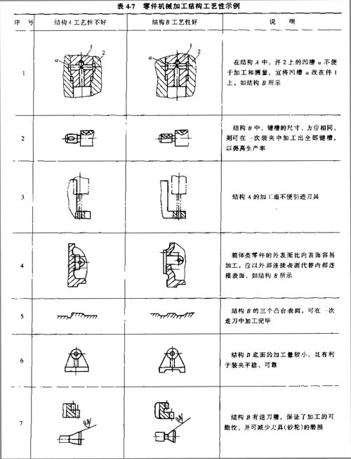 表4-7 列舉了零件機(jī)械加工結(jié)構(gòu)工藝性對(duì)比的一些典型實(shí)例,可供分析零件結(jié)構(gòu)的加工工藝性時(shí)參考。