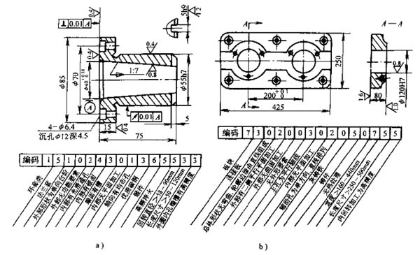 JLBM-1編碼系統(tǒng)由15個碼位組成(見圖5-3),其中主碼9位,輔碼6位。主碼的第一、第二位為名稱類別矩陣,主要反映零件的功能和主要結(jié)構(gòu),第三至第九位表示零件在形狀與加工方面的各種特征。6位輔碼則分別代表零件的材料、毛坯、熱處理、主要尺寸和精度等有關(guān)信息。每一碼位包括0~9的十個特征項(xiàng)。JLBM-1為混合式結(jié)構(gòu),名稱類別分回轉(zhuǎn)件和非回轉(zhuǎn)件兩大類,各自成樹狀結(jié)構(gòu),各類的第三至第九位碼分別成鏈?zhǔn)浇Y(jié)構(gòu),輔碼也是鏈?zhǔn)浇Y(jié)構(gòu)。JLBM-1系統(tǒng)的特點(diǎn)是零件類別按名稱類別矩陣劃分,便于設(shè)計(jì)、檢索;分類表簡單,定義明確,容易掌握;碼位適中,又有足夠的信息容量。圖5-4表示了回轉(zhuǎn)體和非回轉(zhuǎn)體零件用該分類編碼系統(tǒng)進(jìn)行編碼的示例。