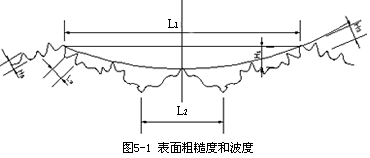 加工表面的微觀幾何特征主要包括表面粗糙度和表面波度兩部分組成,如圖 5— 1所示。表面粗糙度是波距 L小于 1mm的表面微小波紋;表面波度是指波距 L在 1~ 20mm之間的表面波紋。通常情況下,當(dāng) L/H(波距 /波高)﹤ 50時為表面粗糙度, L/H=50~ 1000時為表面波度。