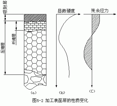 表面層的物理力學(xué)性能包括表面層的加工硬化、殘余應(yīng)力和表面層的金相組織變化。機械零件在加工中由于受切削力和熱的綜合作用,表面層金屬的物理力學(xué)性能相對于基本金屬的物理力學(xué)性能發(fā)生了變化。圖 5— 2a所示為零件表面層沿深度方向的變化。最外層生成有氧化膜或其他化合物,并吸收、滲進氣體粒子,稱為吸附層。吸附層下是壓縮層,它是由于切削力的作用造成的塑性變形區(qū),其上部是由于刀具的擠壓摩擦而產(chǎn)生的纖維層。切削熱的作用也會使工件表面層材料產(chǎn)生相變及晶粒大小變化。