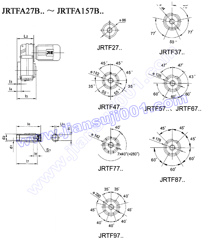 JRTF平行軸——斜齒輪減速電機(jī)安裝尺寸(JRTF27..~JRTF157..,JRTFA27B..~JRTFA157B..) |
