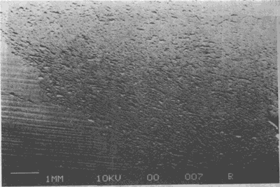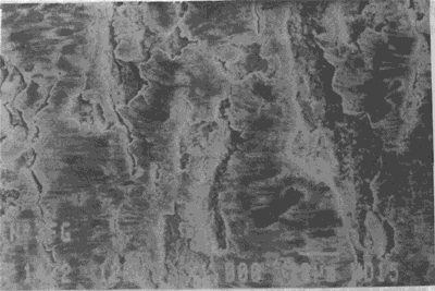 油膜相對于重載很薄的潤滑條件下運轉(zhuǎn)的齒輪副工作齒面的損傷。損傷面放大后可見密密麻麻成片的微小蝕微小裂紋。