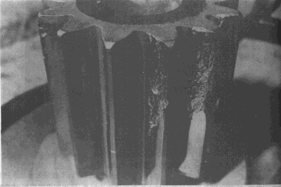 氮化小齒輪幾個輪齒上最大負載區(qū)域的剝落。