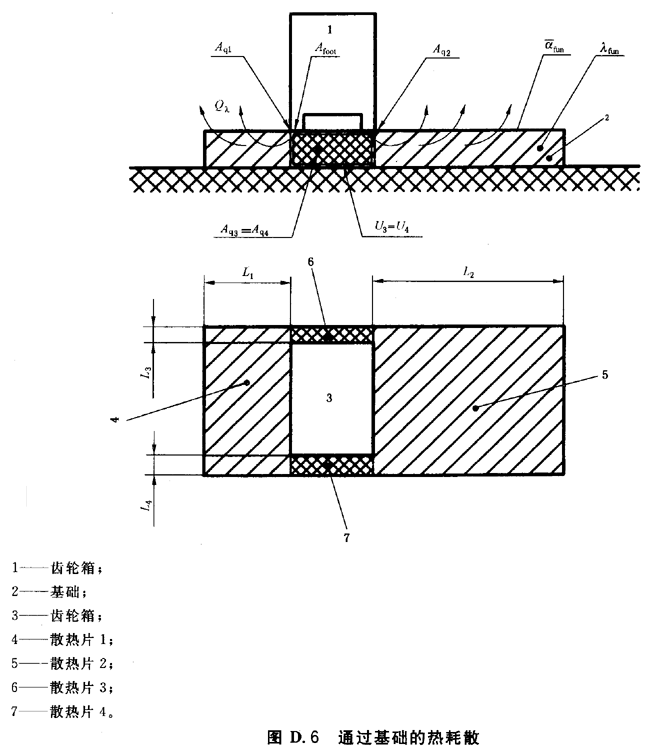 基礎(chǔ)傳導(dǎo)的熱計算是建立在將齒輪箱基礎(chǔ)分割成幾個部分,每一部分被看作為一個單獨的散熱片,使用從熱力學(xué)得出的已知散熱片計算公式。沿各部分表面的熱流Aqi相加得到整個基礎(chǔ)的熱傳導(dǎo)量(見圖D.6)。
