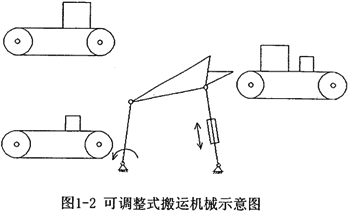 圖1-2所示是一種可調(diào)整曲柄搖桿機(jī)構(gòu)組成的搬運(yùn)機(jī)械。其中,一個(gè)普通電機(jī)驅(qū)動(dòng)曲柄等速回轉(zhuǎn),在搖桿上還安裝有一個(gè)控制電機(jī)。該機(jī)械的工作原理為:右邊的傳送帶上送來的箱子有大有小。要求將大箱子般到左上方的傳送帶上,而將小箱子般到左下方的傳送帶。恰當(dāng)設(shè)計(jì)連桿機(jī)構(gòu)的尺度,并利用控制電機(jī)來調(diào)整搖桿的長度,可以分別完成上述任務(wù)。