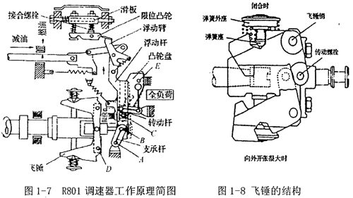 圖1-7為R801調(diào)速器的工作原理簡圖,圖1-8為飛錘結(jié)構(gòu)圖。該調(diào)速器采用特殊的凸輪機(jī)構(gòu)和浮動(dòng)桿的可變杠桿比(1.1~5.4)進(jìn)行調(diào)速,可獲得多種適應(yīng)特性。在調(diào)速器上部,裝有全負(fù)荷限位機(jī)構(gòu),用于確定限位凸輪的位置。調(diào)整全負(fù)荷限位機(jī)構(gòu),將使滑板左右移動(dòng)。擰出或擰進(jìn)接合螺栓,可調(diào)整限位凸輪上下移動(dòng)偏轉(zhuǎn)一微小角度,以此改變限位凸輪型線方程。操縱手柄和轉(zhuǎn)動(dòng)桿固定在操縱手柄軸上,轉(zhuǎn)動(dòng)桿帶動(dòng)導(dǎo)向軸,導(dǎo)向軸的一端沿凸輪盤中滑槽的型線作運(yùn)動(dòng)。其另一端帶有一滑塊,滑塊在圓柱形的浮動(dòng)桿內(nèi)上下移動(dòng),以此實(shí)現(xiàn)可變杠桿比。如調(diào)節(jié)手柄轉(zhuǎn)到“怠速”位置時(shí),浮動(dòng)臂不與限位凸輪接觸,此時(shí)限位凸輪不起作用。如果發(fā)動(dòng)機(jī)轉(zhuǎn)速超過設(shè)定的轉(zhuǎn)速,則飛錘更張開,使滑動(dòng)螺栓左移,B點(diǎn)繞A點(diǎn)逆時(shí)針轉(zhuǎn)動(dòng),同時(shí)浮動(dòng)桿繞C點(diǎn)按順時(shí)針方向轉(zhuǎn)動(dòng),拉引調(diào)節(jié)齒桿向“怠速”位置移動(dòng),而使發(fā)動(dòng)機(jī)轉(zhuǎn)速下降。如果怠速時(shí)柴油機(jī)轉(zhuǎn)速下降,則會(huì)產(chǎn)生與上述相反的過程。