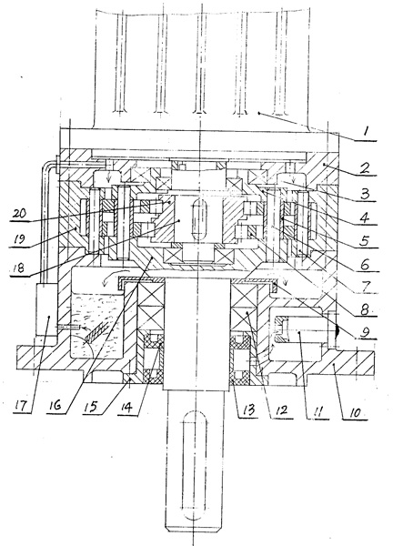 | 一種釜用不泄漏減速機,由擺線輪[8]、輸入軸[18]、偏心軸承[20]、機座[10]、針齒輪及W輸出機構組成,其中針齒輪由針齒殼[19],均布在針齒殼上的針齒[7]構成,W機構由輸出軸[16]與均布在輸出軸圓盤上的柱銷[6]及柱套[5]構成,其特征在于: a)機座[10]內有一儲油腔,機座外壁有一油泵[17]用來將儲油腔的潤滑油泵至減速機頂端由上而下對機件進行潤滑; b)在輸出軸支承軸承[12]頂端有一圓環(huán)蓋[9],其高度高于儲油面1~3cm,用以防止從沿輸出軸漏油; c)在輸出軸軸承[12]下端有一個密封組件,它由套筒[15]及裝在套筒內的密封[13]、[14]構成,二密封之間要有一定空間,密封組件用以防止有毒介質從反應釜中泄漏到減速機內腔。 |