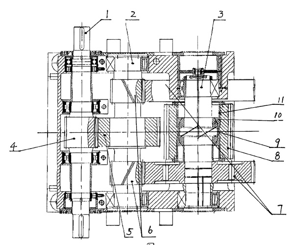 本實(shí)用新型提供了一種水泥磨機(jī)用單邊雙傳動(dòng)減速機(jī),主要由第一軸1、第二軸2及第三軸3組成,其特征在于:第一軸1與第三軸3之間有第二軸2,第三軸3有兩個(gè),兩個(gè)第三軸與第二軸2的軸間距相等,第一軸1上的小齒輪4與第二軸2上的大齒輪5為直齒嚙合,第二軸2上的小齒輪6同時(shí)與兩個(gè)第三軸3上的大齒輪7斜齒嚙合,并且同一軸上的兩個(gè)小齒輪6或大齒輪7螺旋方向相反,螺旋角相等,第三軸3的中部設(shè)置有圓柱齒輪8。本實(shí)用新型結(jié)構(gòu)簡(jiǎn)單、緊湊,體積小,并且動(dòng)力傳遞的均載同步性好。