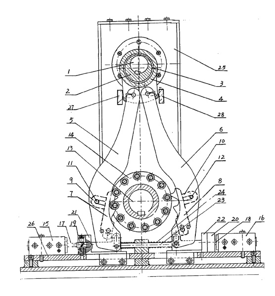 | 一種換向減速機包括殼體,換向裝置,主動輪,被動輪,輸出軸,輸入軸,其特征在上述所述的輸入軸(1)上固定偏心輪(2),偏心輪(2)外圓上有偏心軸承(3),偏心輪軸承(3)外圓上有拉板套(4),拉板套(4)上分別鉸連左拉板(5)、右拉板(6);左拉板(5)上鉸連左拉鉤(7),左拉鉤(7)上固定左拉鉤導塊(9);用左拉鉤導塊銷(11)與左拉板(5)鉸連;在右拉板(6)上鉸連右拉鉤(8),右拉鉤(8)上固定右拉鉤導塊(10)用右拉鉤導塊銷(12)與右拉板(6)鉸連,在輸出軸(13)上固定套筒滾子輪(14),在底板(26)上固定左程控液力缸(15)、右程控液力缸(16),左拉板導板(21),右拉板導板(22);在左程控液力缸(15)內(nèi)裝左柱塞(17),用左拉板鎖定器(19)與左拉板導板(21)連接,在右程控液力缸(16)內(nèi)裝有右柱塞(18),用右拉板鎖定器(20)與右拉板導板(22)連接,解鎖彈簧(24)套在推桿(23)上,拉板套(4)兩側設置有左限位板(27),右限位板(28)。 |