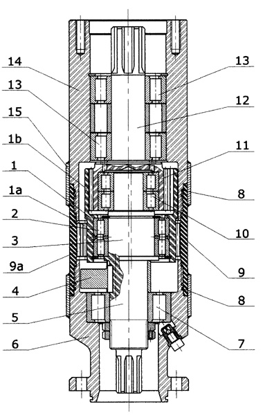 | 一種潛油泵專用減速機,其主要結(jié)構(gòu)特征是雙聯(lián)行星齒輪安裝在輸入軸的偏心軸頸上,其下端的小齒輪與固定齒圈相嚙合,上端的齒圈與輸出軸上的小齒輪相嚙合,輸入軸的下端安裝在下接頭上,上端安裝在輸出軸上,輸出軸則安裝在上接頭上;由于偏心軸頸的作用,使行星齒輪在齒圈內(nèi)作既有公轉(zhuǎn)又有自轉(zhuǎn)的行星運動,并帶動輸出軸上的小齒輪轉(zhuǎn)動,輸出軸即可將該轉(zhuǎn)速輸出。本實用新型可使用在深度大于1000米的深井中,并能在100℃-200℃的高溫下及10兆帕以上的高壓下穩(wěn)定運轉(zhuǎn),其超載能力及耐熱、抗磨損性能均極強,結(jié)構(gòu)簡單緊湊,生產(chǎn)成本較低。 |