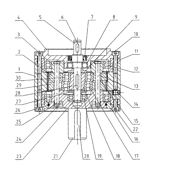 | 一種星輪減速機(jī),包括輸入軸、輸出軸、齒輪、齒圈和通蓋,其特征是:減速機(jī)殼內(nèi)裝有輸入軸、輸出軸、齒輪、齒圈,輸入軸裝有偏心套(18),輸入軸(5)有雙支撐軸承(8、19),偏心套裝有兩偏心軸承(17、30),兩偏心軸承(17、30)分別裝有齒輪(2、29),兩齒輪(2、29)外聯(lián)接齒圈(1),兩齒輪(2、29)由連接銷(xiāo)軸(13)固定于均載盤(pán)(3)和軸出軸(21),均載盤(pán)(3)設(shè)有軸承(12),輸出軸(21)外圓與通蓋(16)間裝有密封圈。 |