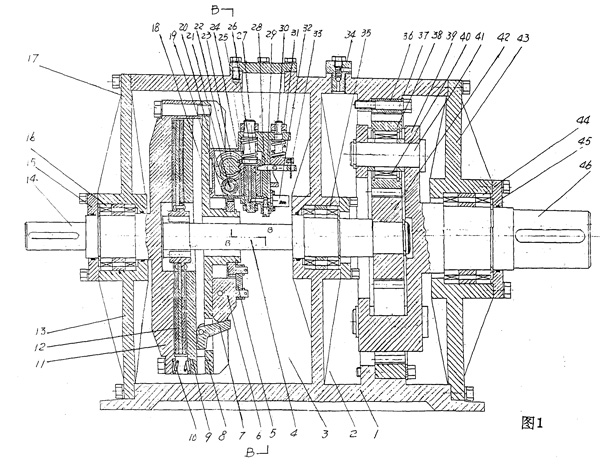 | 一種軟啟動(dòng)減速機(jī),在其機(jī)殼(1)及端蓋的軸承座中裝有輸入軸(14)、輸出軸(46)、其間裝有減速齒輪組,其特征在于: 輸入軸(14)連接一組摩擦片離合器,該離合器主要由裝在軸壓盤(11)與壓爪盤(8)之間的壓盤(9)和摩擦片組(12)構(gòu)成,該軸壓盤(11)、壓盤(9)及壓爪盤(8)以螺釘(17)連接為一體,該壓盤(9)與軸壓盤(11)之間裝有分離彈簧(10);該摩擦片組(12)至少包括兩片外片(121)及夾持于外片之間的內(nèi)片(122),該內(nèi)片中心固接一花鍵套(123); 在摩擦片離合器與減速齒輪組之間以一花鍵軸(4)連接,該花鍵軸(4)的花鍵端連接花鍵套(123),另端以鍵連接齒輪(42),其中部由機(jī)體(1)的中間軸承座(35)支承;在摩擦片離合器的壓爪盤(8)的外側(cè)面上裝有軟啟動(dòng)器(3),其構(gòu)造為:在壓爪盤(8)上鉸接有等分圓周的至少二組壓爪(7),該壓爪的內(nèi)臂(701)接觸壓盤(9),該壓爪(7)的外臂(702)接觸離心塊(6)的頂端,該離心塊(6)裝在壓爪盤(8)的徑向滑槽(801)中,該離心塊(6)鉸接于連桿(5),該連桿(5)傾斜鉸接調(diào)速齒輪(19),該調(diào)速齒輪(19)固裝在壓爪盤(8)的空心軸套(802)上;該調(diào)速齒輪(19)連接時(shí)間調(diào)節(jié)器(18); 至少二組時(shí)間調(diào)節(jié)器(18),其數(shù)量與壓爪(7)的數(shù)量相同,各安裝在軟啟動(dòng)器(3)相鄰兩壓爪(7)之間的壓爪盤(8)上,每一時(shí)間調(diào)節(jié)器(18)的構(gòu)造為:在時(shí)間調(diào)節(jié)器外殼(48)中平行地安裝有螺桿式軸齒輪(21)和軸齒輪(22),該螺桿式軸齒輪(21)螺接套裝有一內(nèi)螺紋式齒條(20)而可軸向移動(dòng),該內(nèi)螺紋式齒條(20)與調(diào)速齒輪(19)嚙合,該螺桿式軸齒輪(21)與軸齒輪(22)的同軸齒輪(23)嚙合,該軸齒輪(22)與齒條式空氣缸(24)的齒條嚙合,該齒條式空氣缸(24)的內(nèi)螺紋端與導(dǎo)向桿(26)的外螺紋端涂密封膠螺接,該導(dǎo)向桿(26)外圓套裝彈簧(27),該齒條式空氣缸(24)內(nèi)孔中裝有柱塞(25),該柱塞(25)另端固定于機(jī)殼(1),該齒條式空氣缸(24)徑向移動(dòng)與套裝于其內(nèi)部的柱塞(25)之間形成氣室,該氣室經(jīng)柱塞(25)、節(jié)流閥(29)、空氣過(guò)濾器(32)與外界空氣相通;該柱塞(25)上端受套裝在導(dǎo)向桿(26)外圓上的彈簧的壓力,該齒條式空氣缸(24)側(cè)面插入開鎖銷(28)的頭部,該開鎖銷(28)中部以銷軸(47)鉸接于開鎖銷(28),其尾 |