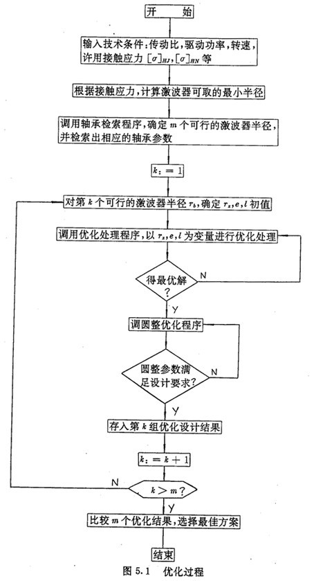由于激波器一般使用通用軸承,所以激波器半徑Tb應結合軸承標準來選擇。在程序中,先給各傳動參數指定其取值范圍的中間數值,然后根據接觸應力計算,確定滿足強度條件的最小激波器半徑,由軸承檢索程序,確定若干個可行的激波器半徑。在確定可行的激波器半徑時,為了使減速器外徑尺寸不致過大,僅把與應力計算結果相近的軸承半徑及其相鄰型號半徑作為可行的激波器半徑。對每一個可行的激器半徑Tb,調用優(yōu)化子程序以TZ,e,l為優(yōu)化變量進行優(yōu)化處理。其算法流程如圖5.1所示。