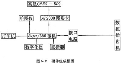 本系統(tǒng)是在一臺微型計算機super/386基礎上,增加一塊選進的圖形卡,一臺高分辨率顯示器,數控接口電路及相應設備,組成了一個微機工作站,如圖5.2所示。