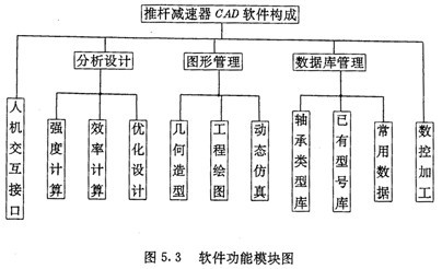 軟件主要由分析設計、圖形管理、數據庫管理及摟控加工四大部分組成,并提供了一個友好的人機交互接口界面用于實現漢字人機對話。本交互接口由三級推拉彈出式菜單組成。軟件模塊結構如圖5.3所示。各大模塊的主要功能及特點如下: