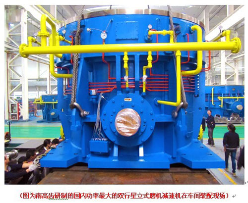 2011年11月,南京高精傳動設(shè)備制造集團(tuán)有限公司(簡稱:南高齒)子公司南京高精齒輪集團(tuán)有限公司自主研發(fā)制造的國內(nèi)功率最大的雙行星立式磨機(jī)減速機(jī)成功試車。該減速機(jī)型號為MLXSS540,輸入功率5400kW,各項(xiàng)試驗(yàn)性能優(yōu)秀,目前已交付客戶使用。此前,國內(nèi)首臺3600kW雙行星立式磨機(jī)減速機(jī)亦是由南高齒研制。