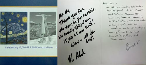 GE慶祝第15000臺(tái)1.5MW風(fēng)機(jī)時(shí)寫(xiě)給南高齒董事長(zhǎng)兼總經(jīng)理胡曰明先生的信