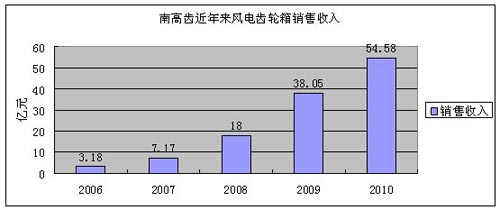 2010年南高齒實(shí)現(xiàn)銷(xiāo)售收入73.93億元,較2009年56.47億元增長(zhǎng)30.9%。其中風(fēng)電齒輪箱繼續(xù)保持高速增長(zhǎng)態(tài)勢(shì),全年實(shí)現(xiàn)銷(xiāo)售 收入54.58億元,較2009年大幅增長(zhǎng)43.4%,2009年風(fēng)電齒輪箱銷(xiāo)售收入為38.05億元。