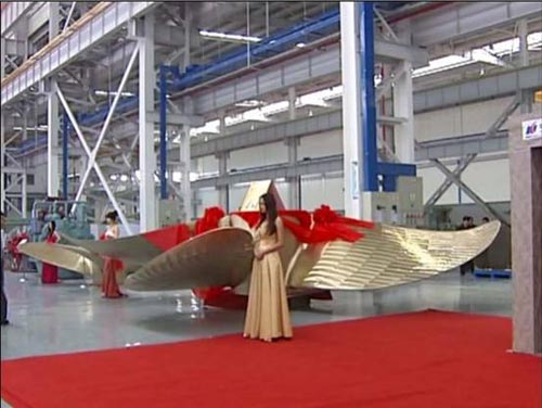 了快速地發(fā)展,產(chǎn)品深得海內(nèi)外客戶的信賴,公司已累計生產(chǎn)固定槳3000 余件、可調(diào)槳600余套。2009 年8 月28 日,中國傳動戰(zhàn)略投資同舟,技改投入2.55 億元。自去年底新廠區(qū)試生產(chǎn)至今已累計交付47500DWT、82000DWT、176000DWT 配套的螺旋槳產(chǎn)品10 余套。