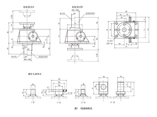 1型結構型式的絲桿頭部分為Ⅰ型(圓柱型)、Ⅱ型(法蘭型)、Ⅲ型(螺紋型)、Ⅳ型(扁頭型)四種型式;