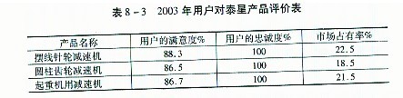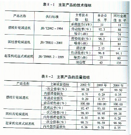 公司董事長張國林提出并率先在泰星減速機(jī)股份有限公司全面推行的以“三改、三制、三化”為主線的一系列的管理理念、管理模式、管理方法、運(yùn)行機(jī)制和創(chuàng)新機(jī)制,不僅對公司的內(nèi)部管理產(chǎn)生了巨大的成效,取得了很好的企業(yè)效益,且得到了社會的廣泛認(rèn)可,產(chǎn)生了很好的社會效應(yīng)和一定的理論效應(yīng)。 I 推動企業(yè)發(fā)展 創(chuàng)造了超一流的產(chǎn)品 泰星減速機(jī)股份有限公司正是認(rèn)真貫徹了公司董事長張國林的“一保產(chǎn)品質(zhì)量,二保供貨期”的質(zhì)量思想,在企業(yè)員工中形成了一種“用戶在我心中、質(zhì)量在我手中、用戶的需求就是我們的追求、用戶滿意才有我們的滿意”的質(zhì)量共識,為用戶提供了國內(nèi)領(lǐng)先、國際一流的高質(zhì)量的產(chǎn)品。 泰星產(chǎn)品的高質(zhì)量體現(xiàn)在:代表主要產(chǎn)品質(zhì)量水平的主要技術(shù)指標(biāo)遠(yuǎn)遠(yuǎn)超過了同行業(yè)的最佳水平。見表8—1。 主要產(chǎn)品的質(zhì)量指標(biāo)遠(yuǎn)遠(yuǎn)超過了國內(nèi)的最好水平。主要產(chǎn)品的質(zhì)量水平見表8—2。 到2004年泰星減速機(jī)股份有限公司的產(chǎn)品合格率連續(xù)11年達(dá)到100%,一等品率2004年達(dá)到95.3%,優(yōu)等品率達(dá)到72.50%。 泰星公司生產(chǎn)的產(chǎn)品噪音低,無污染,環(huán)境指標(biāo)達(dá)到了國內(nèi)的同行業(yè)的領(lǐng)先水平。  增強(qiáng)了研發(fā)能力 公司董事長張國林認(rèn)識到:“技術(shù)創(chuàng)新是企業(yè)發(fā)展的關(guān)鍵。沒有先進(jìn)的技術(shù),先進(jìn)的設(shè)備和工藝,就不可能生產(chǎn)出質(zhì)量過硬的產(chǎn)品,企業(yè)也無法立足于市場,擴(kuò)大規(guī)模,企業(yè)發(fā)展也就成為一句空話”。因此,董事長張國林非常重視企業(yè)科技開發(fā)工作,一方面,不斷加大公司的科技研發(fā)費(fèi)用的投人,早在2000年泰星減速機(jī)股份有限公司的研究與開發(fā)費(fèi)用已經(jīng)占到公司當(dāng)年銷售收入的9.7%,遠(yuǎn)遠(yuǎn)超過了國內(nèi)同行業(yè)企業(yè)的先進(jìn)水平,已經(jīng)接近國外大型跨國公司10%的最好水平,泰星股份公司的研究與開發(fā)費(fèi)用還在以每年20%的速度在增長;另一方面,為了提高企業(yè)的技術(shù)研發(fā)能力,泰星股份公司于1998年初就成立了減速機(jī)研究所,研究所取得了豐碩的科研成果,他們自主設(shè)計、自主研制、自主開發(fā)的9000系列擺線釷輪減速機(jī)、9000系列硬齒面減速機(jī)、9000系列中硬齒面減速機(jī)達(dá)到了國際21世紀(jì)先進(jìn)水平。 營造了整潔的工作環(huán)境 泰星股份公司董事長張國林認(rèn)為:一方面,優(yōu)美的廠區(qū)環(huán)境,是企業(yè)領(lǐng)導(dǎo)層富有戰(zhàn)略眼光的重要反映,也是企業(yè)形象和職工精神面貌的綜合體現(xiàn)。它有利于避免因外部環(huán)境干擾而引起的不良心理和生理現(xiàn)象,激發(fā)職工的勞動熱情,提高勞動生產(chǎn)率;另一方面,公司的員工每天要在公司工作八個小時,公司、工廠、車間的環(huán)境美化了,能為員工營造一個舒適的工作環(huán)境,保證員工心情愉快,使員工處在一種愉悅的工作狀態(tài)中,這樣也有利于產(chǎn)品質(zhì)量的提高。因此,按照定制工藝的要求,本著使人機(jī)物處于最佳優(yōu)化組合狀態(tài)的原則,對公司的各個部門,車間內(nèi)部進(jìn)行了合理的平面布置,并重點(diǎn)抓了“兩通”“三化”工程建設(shè),不僅保證了車間內(nèi)的工作環(huán)境清潔、整齊,且使整個廠區(qū)布局合理、美麗、整潔。難怪國外的 同行來星股份公司考察時,發(fā)出了這樣的贊嘆:“簡直就是一座花園式的工廠”。 形成了愛廠如家的工作熱情 沒有工作制度,沒有任何約束,員工自愿一天為企業(yè)工作14個小時。這種工作熱情在目前的市場經(jīng)濟(jì)社會中是罕見的。泰星公司員工的這種工作熱情來源于張國林董事長提出的“能上能下,競爭上崗:實績計酬”,“生活溫暖化”等一系列管理理念、管理方法在太星中的推行張董事長的這些管理理念與管理方法的實施,在企業(yè)內(nèi)部為員工們創(chuàng)造了一種發(fā)揮自己的才能,發(fā)揮自已的水平:一切憑實績講話,~切憑數(shù)據(jù)講話的氛圍。讓員工們也感受到了為企業(yè)工作的甜頭,感受到了他們的切身利益是與企業(yè)的榮辱:興衰密不可分的。因此,員工們愿意也樂意為企業(yè)工作。 創(chuàng)造了領(lǐng)先同行業(yè)十年的輝煌業(yè)績 由于董事長張國林治企有方,使泰星公司得到了快速的發(fā)展。在1993年,衡量公司經(jīng)濟(jì)效益的主要指標(biāo):資金利潤率、銷售利潤率、成本費(fèi)用利潤率、總資產(chǎn)貢獻(xiàn)率、流動資金周轉(zhuǎn)率、全員勞動生產(chǎn)率:產(chǎn)品銷售率、質(zhì)量損失率、新產(chǎn)品產(chǎn)值率以及萬元總產(chǎn)值綜合能耗均保持在全國同行業(yè)的領(lǐng)先水平。 在2003年泰星股份公司的主要經(jīng)濟(jì)效益指標(biāo)分別為:總資產(chǎn)零獻(xiàn)率為29.25%,資本保值增值率127.83%,資金周轉(zhuǎn)率2.64次,成本費(fèi)用利潤17.33%,全員勞動產(chǎn)生產(chǎn)率22.36萬元/人,產(chǎn)銷率100.30,產(chǎn)品質(zhì)量等
