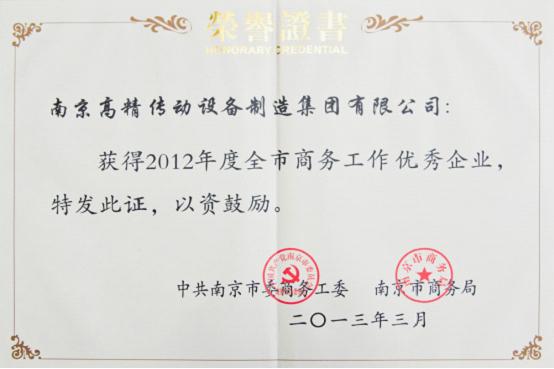 2013年3月15日,南京市政府在市級(jí)機(jī)關(guān)大禮堂召開全市商務(wù)工作會(huì)議,全面總結(jié)2012年全市商務(wù)工作,部署2013年商務(wù)工作目標(biāo)任務(wù)。南京高精傳動(dòng)設(shè)備制造集團(tuán)有限公司(以下簡稱:南高齒)因成績突出被授予2012年度全市商貿(mào)工作優(yōu)秀企業(yè)稱號(hào)。