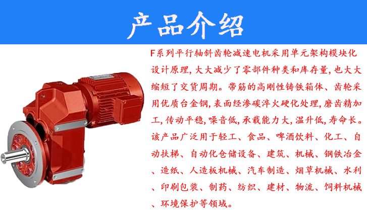 F系列平行軸斜齒輪減速電機采用單元架構(gòu)模塊化設計原理,大大減少了零部件種類和庫存量,也大大縮短了交貨周期。帶筋的高剛性鑄鐵箱體、齒輪采用優(yōu)質(zhì)臺金鋼,表面經(jīng)滲碳淬火硬化處理,磨齒精加工,傳動平穩(wěn),噪音低,承載能力大,溫升低,壽命長。該產(chǎn)品廣泛用于輕工、食品、啤酒飲料、化工、自動扶梯、自動化倉儲設備、建筑、機械、鋼鐵冶金、造紙、人造板機械、汽車制造、煙草機械、水利、印刷包裝、制藥、紡織、建材、物流、飼料機械、環(huán)境保護等領域。