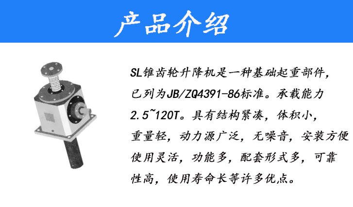 SL錐齒輪升降機(jī)是一種基礎(chǔ)起重部件,已列為JBZQ4391-86標(biāo)準(zhǔn)。承載能力2.5~120T。具有結(jié)構(gòu)緊湊、體積小、重量輕、動力源廣泛、無噪音、安裝方便、使用靈活、功能多、配套形式多,可靠性高、使用壽命長等許多優(yōu)點。