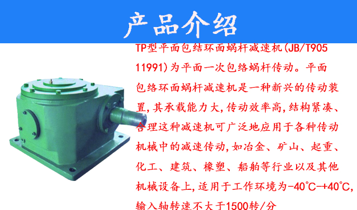 TP系列平面包絡(luò)環(huán)面蝸桿減速器(JBT9051-1999)為平面一次包絡(luò)蝸桿傳動(dòng),包括tpU、TPS、TPA三種形式,適用于冶金、礦山、起重、運(yùn)輸、建筑、石油、化工、航天、航海設(shè)備或精密傳動(dòng)的減速傳動(dòng)。