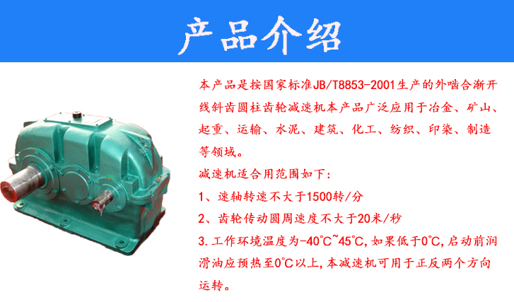 本產(chǎn)品是按國家標(biāo)準(zhǔn)JB/T8853-2001生產(chǎn)的外嚙合漸開線斜齒圓柱齒輪減速機(jī)本產(chǎn)品廣泛應(yīng)用于冶金、礦山、起重、運(yùn)輸、水泥、建筑、化工、紡織、印染、制造等領(lǐng)域。減速機(jī)適合用范圍如下:1,速軸轉(zhuǎn)速不大于1500轉(zhuǎn)/分2齒輪傳動(dòng)圓周速度不大于20米/秒。3.工作環(huán)境溫度為-40℃~45℃,如果低于0℃,啟動(dòng)前潤滑油應(yīng)預(yù)熱至0℃以上,本減速機(jī)可用于正反兩個(gè)方向運(yùn)轉(zhuǎn)