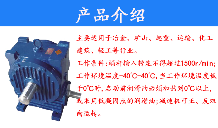 主要適用于冶金、礦山、起重、運(yùn)輸、化工、建筑、輕工等行業(yè)。工作條件:蝸桿輸入轉(zhuǎn)速不超過(guò)1500r/min;工作環(huán)境溫度為-40~40℃,當(dāng)工作環(huán)境溫度低于0℃時(shí),啟動(dòng)前潤(rùn)滑油必須加熱到0℃以上,或采用低凝固點(diǎn)的潤(rùn)滑油;減速器可正、反雙向運(yùn)轉(zhuǎn)。