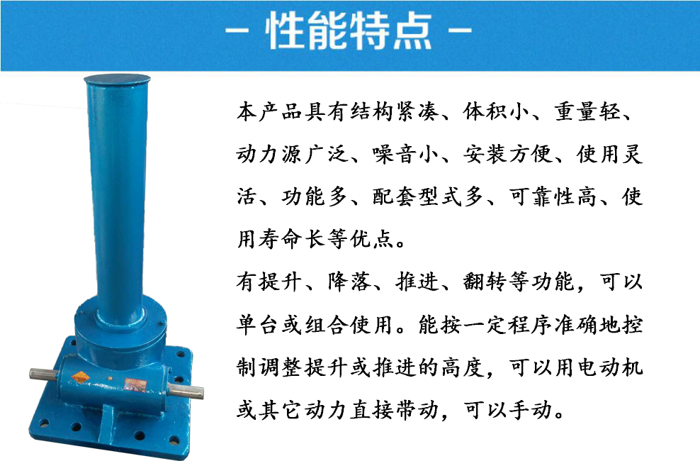承載能力2.5—120T。具有結(jié)構(gòu)緊湊、積小、重量輕、動(dòng)力源廣泛、無噪音、安裝方便、使用靈活、功能多、配套形式多、可靠性高、使用壽命長(zhǎng)許多優(yōu)點(diǎn)。具有提升、降落、推進(jìn)、翻轉(zhuǎn)等多種功能,可以單臺(tái)或組合使用,能按一定程序準(zhǔn)確地控制調(diào)整升或推進(jìn)的高度,可以用電動(dòng)機(jī)或其它動(dòng)力直接帶動(dòng),也可以手動(dòng)。最高輸入轉(zhuǎn)速1500r/min,最大提升速2.7m/min。有不同的結(jié)構(gòu)型式和裝配方式,提升高度按用戶的要求制造。該裝置可以自鎖。
