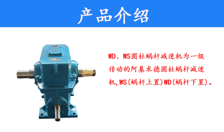 WD、WS圓柱蝸桿減速機(jī)為一級傳動(dòng)的阿基米德圓柱蝸桿減速機(jī),WS(蝸桿上置)WD(蝸桿下置)。