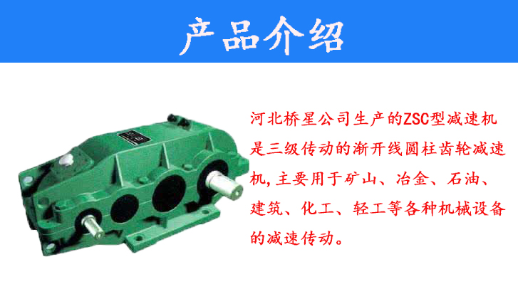 河北橋星公司生產(chǎn)的ZSC型減速機是三級傳動的漸開線圓柱齒輪減速機,主要用于礦山、冶金、石油、建筑、化工、輕工等各種機械設(shè)備的減速傳動。