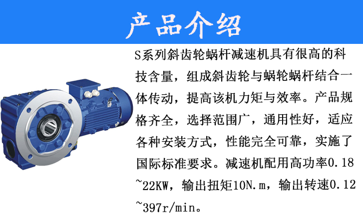 S系列齒輪蝸桿減速電機(jī)具有很高的科技含量,有斜齒輪與蝸輪蝸桿結(jié)合一體傳動(dòng),提高該機(jī)力矩與效率。該系列產(chǎn)品規(guī)格齊全,轉(zhuǎn)速范圍廣,通用性好,適應(yīng)各種安裝方式,性能安全可靠壽命長,實(shí)施了國際標(biāo)準(zhǔn)要求。減速機(jī)配用高功率0.18~22KW,輸出轉(zhuǎn)距10N.m~4890N.m,輸出轉(zhuǎn)速.12~397r/mino
