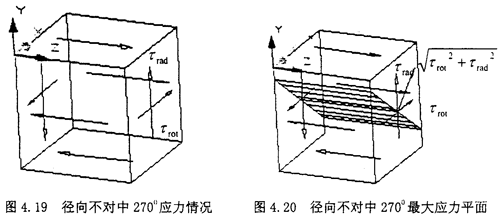 此時(shí)的受力由圖上可以看出,屬于空間應(yīng)力狀態(tài),其基本分析過(guò)程類似于徑向不對(duì)中900狀態(tài),現(xiàn)在將徑向不對(duì)中2700時(shí)的受力情況:σxx=0,σyy=0,σzz=0,τxy=-τrot,σyz=0,σzx=0,σzx=τrod分別代入式(4-29)(4-30)(4-31),得到