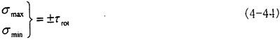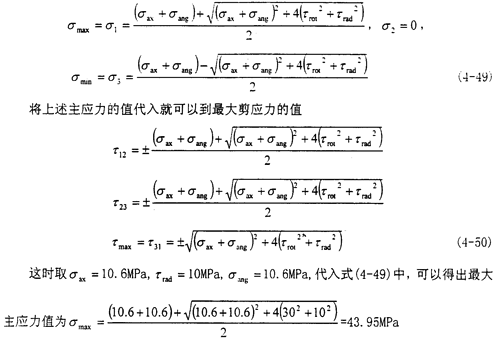 此時的應力情況屬于三向應力狀態(tài),所以其分析過程和徑向不對中90°以及270°以情況相似,只是這里還有了附加的軸向拉應力和附加的角向應力,將各個應力值σxx=σax+σang,σyy=0,σzz=0,τxy=τrot,τyz=0,τzx=τrad分別代入式(4-29)(4-30)(4-31)中,可以得到