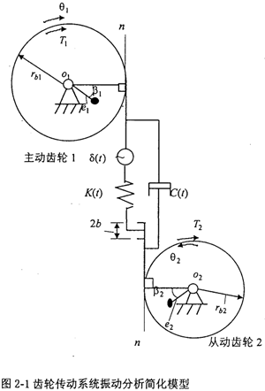 圖2-1中,rb1——主動齒輪基圓半徑;rb2——從動齒輪基圓半徑;K(t)——齒輪嚙合剛度;e1——主動齒輪偏心距;e2——從動齒輪偏心距;β1——主動齒輪不平衡質(zhì)量的初始角度;β2——從動齒輪不平衡質(zhì)量的初始角度;δ(t)——齒輪的綜合誤差;JD1——主動齒輪轉(zhuǎn)動慣量;JD2——從動齒輪轉(zhuǎn)動慣量;C(t)——齒輪阻尼系數(shù);b——齒側(cè)間隙;n-n——齒輪嚙合線方向。