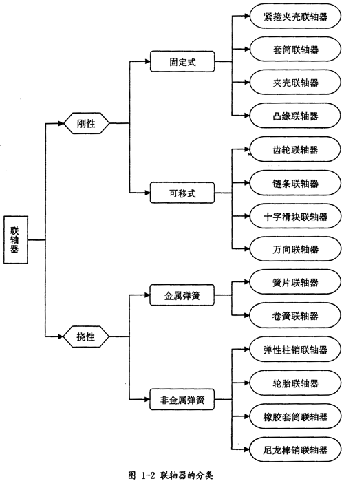 就聯(lián)軸器種類而言,若按補(bǔ)償兩軸相對位移能力的不同可分為:剛性聯(lián)軸器和撓性聯(lián)軸器;剛性聯(lián)軸器按能否允許兩軸有相對位移又可分為:固定式聯(lián)軸器和可移式聯(lián)軸器;撓性聯(lián)軸器按其彈性元件的不同可分為金屬彈簧聯(lián)軸器和非金屬彈簧聯(lián)軸器;若按結(jié)構(gòu)可分為套筒聯(lián)軸器、鏈條聯(lián)軸器、輪胎聯(lián)軸器等等。其總的分類圖如圖1-2所示。