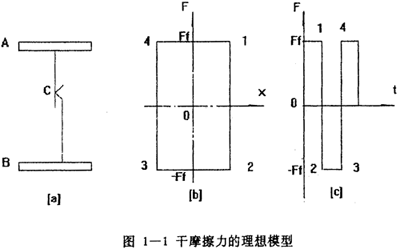 雙線性模型是非線性遲滯系統(tǒng)模型中最簡單的一種,而且也是最為久遠的模型,對于它的初始機理研究最早可追溯到三十年代的Deo Hartog,他在研究干摩擦時提出了干磨擦的理想模型,他認為在一個具有干摩擦面的單自由度系統(tǒng)中,干摩擦力隨相對滑移位移的關(guān)系可用一矩形來表示,如圖1-1所示。當該系統(tǒng)受到外力激勵發(fā)生運動時,干摩擦力總是與運動速度反向而且阻礙運動,進而耗損系統(tǒng)的能量,從時域的角度看,干摩擦力的波形為矩形波,Den Hartog還按能量耗散相等原理,把理想干摩擦等效成粘性阻尼。實際上干摩擦交界面,在外力小于摩擦力時,兩邊就有變形,隨著外力的增加,此變形隨之增大,這是因為交界面兩邊的物質(zhì)有一定的彈性。即使兩邊有較大的滑移時,交界面上的干摩擦力仍然不是常數(shù),而是隨振幅的增大而緩慢上升的。Earlestes等人對此作了描述,認為一旦交界面有了滑移,干摩擦的線性力不是常數(shù)(4Ffπ),而是與相對位移X有關(guān),從Ff變到4Ff/π,表達式為